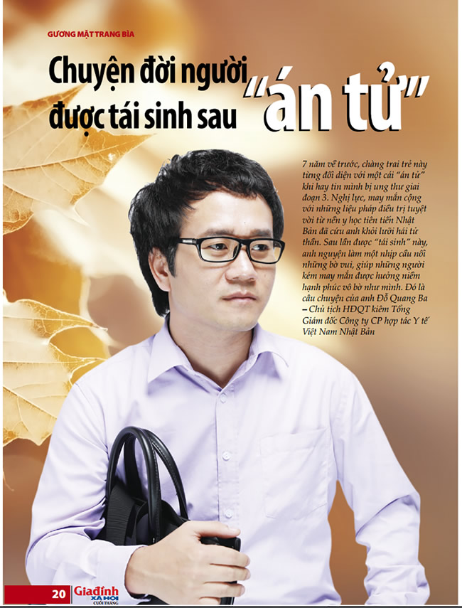 7 năm về trước, chàng trai trẻ này từng đối diện với một cái “án tử” khi hay tin mình bị ung thư giai đoạn 3. Nghị lực, may mắn cộng với những liệu pháp điều trị tuyệt vời từ nền y học tiên tiến Nhật Bản đã cứu anh khỏi lưỡi hái tử thần. Sau lần được “tái sinh” này, anh nguyện làm một nhịp cầu nối những bờ vui, giúp những người kém may mắn được hưởng niềm hạnh phúc vô bờ như mình. Đó là câu chuyện của anh Đỗ Quang Ba - Chủ tịch HĐQT kiêm Tổng Giám đốc Công ty CP hợp tác Y tế Việt Nam Nhật Bản.
